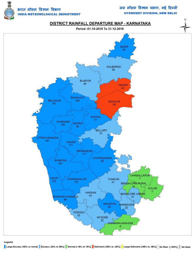 During post monsoon 2019 season, Karnataka had 308.4 mm or 70% above normal rainfall. Coastal Karnataka had 582.3 mm or 127% above normal rains. N I Karnataka had 245.1 mm or 77% above normal rainfall. S I Karnataka received 307.7 mm or 51% above normal rain.