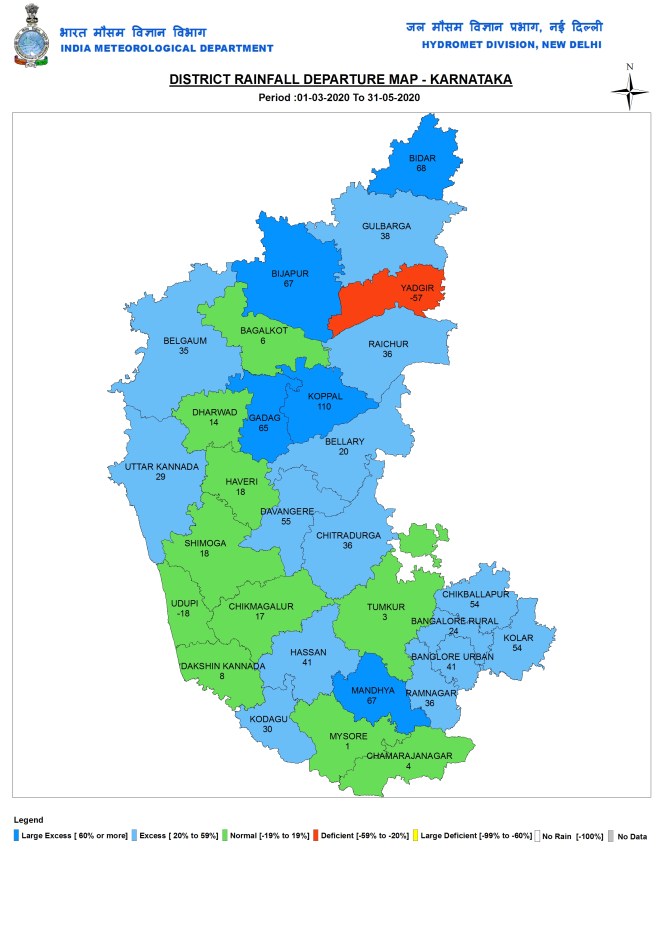 SOUTH INDIA: Karnataka During pre monsoon 2020 season, Karnataka had 149.6 mm or 28% above normal rains. Coastal Karnataka had 171.9 mm or 10% below normal rains. North Interior Karnataka had 111.8 mm or 40% above normal rains. South Interior Karnataka had 177.5 mm or 26% above normal rains.