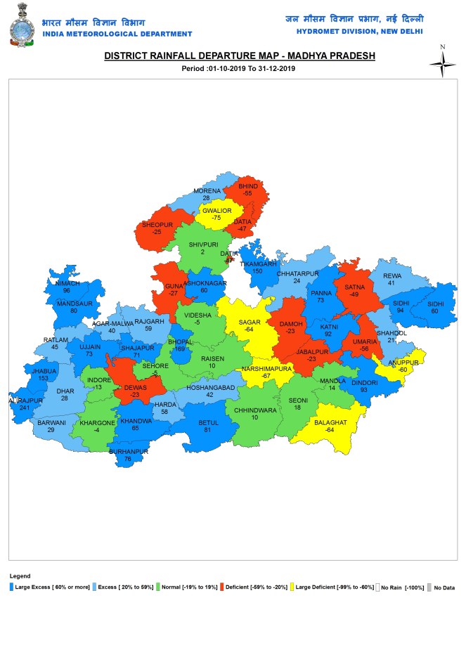 During Post monsoon 2019 season, MP received 64.8 mm rain, 21% above normal. West MP had 68.5 mm, 35% above normal, whereas East MP had 59.9 mm, 4% above normal.