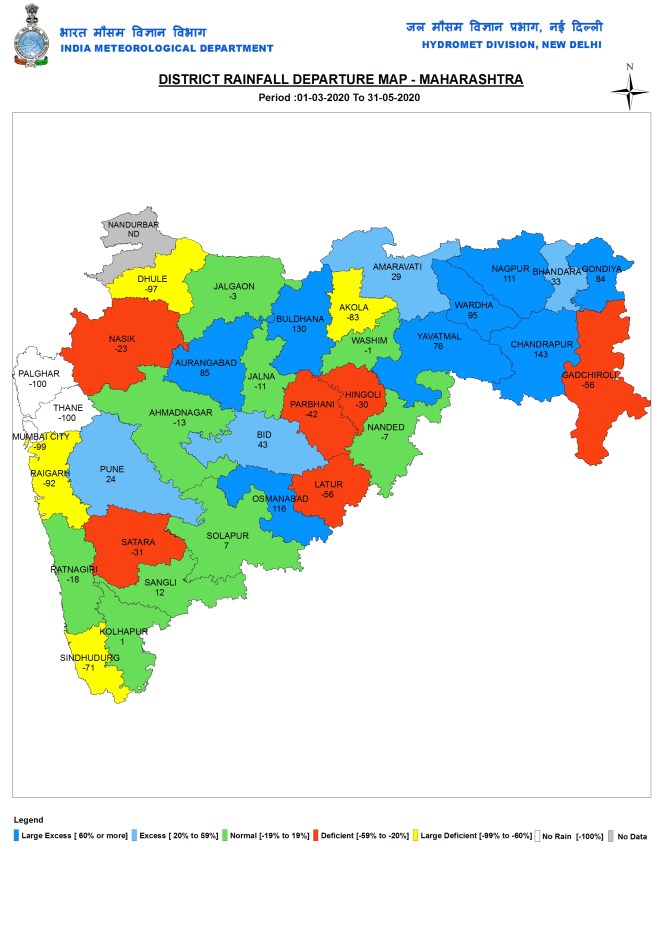 Maharashtra During pre monsoon 2020 season, Maharashtra had 33.5 mm or 14% above normal rains. During this season Madhya Maharashtra had 32.6 mm rainfall, close to normal rains of 32.5 mm. Marathwada had 32.7 mm or 19% above normal rains; Vidarbha had 41.8 mm or 53% above normal rains.
