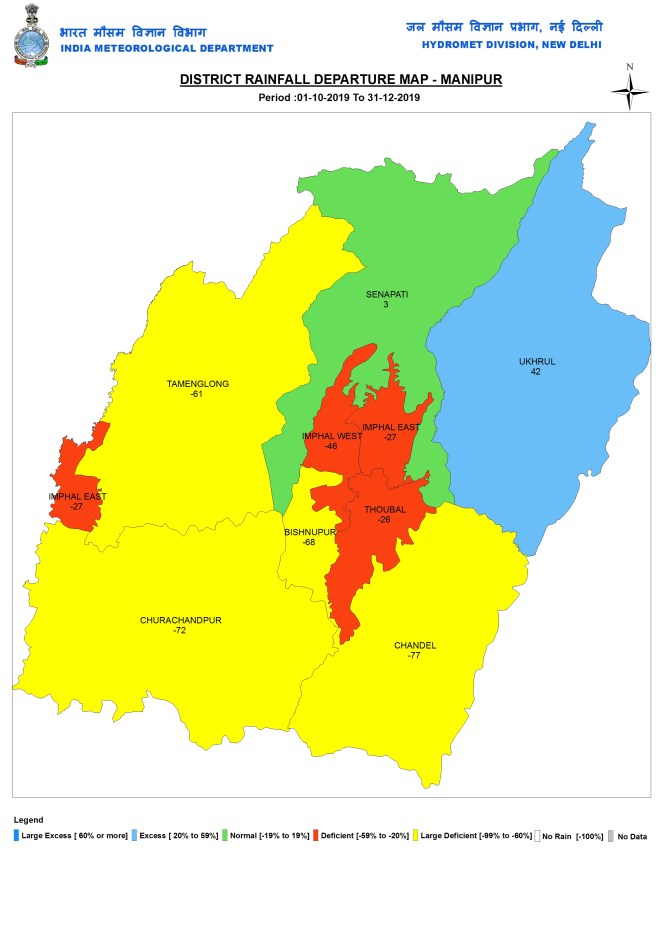 During post monsoon 2019 months, Manipur had 151.2 mm, 33% below normal rains. Chandel dist again had the lowest rainfall at 65.5 mm, while Ukhrul had the highest rainfall at 254 mm.