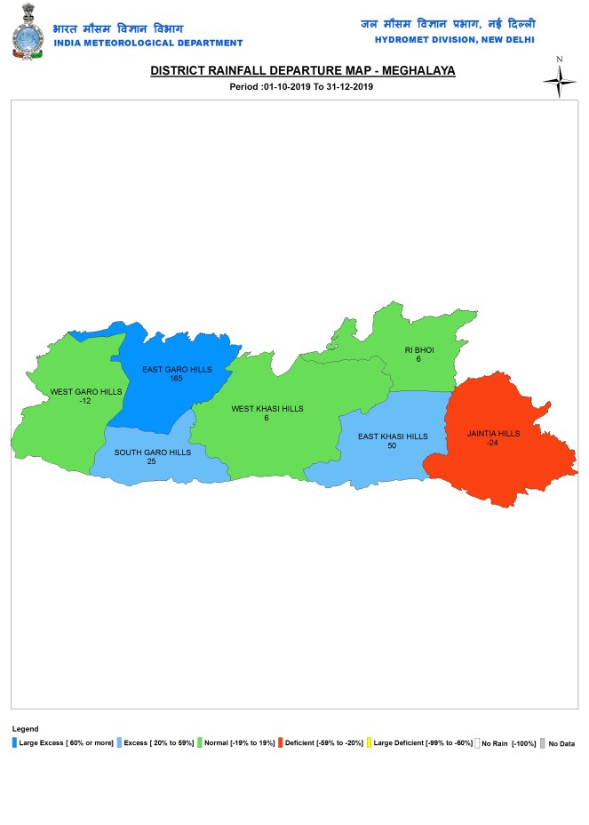 During post monsoon 2019 months, Meghalaya received 365.6 mm or 11% above normal rains. West Garo Hills had the lowest rainfall of 180.4 mm, while East Khasi Hills again had the highest at 537.3 mm.