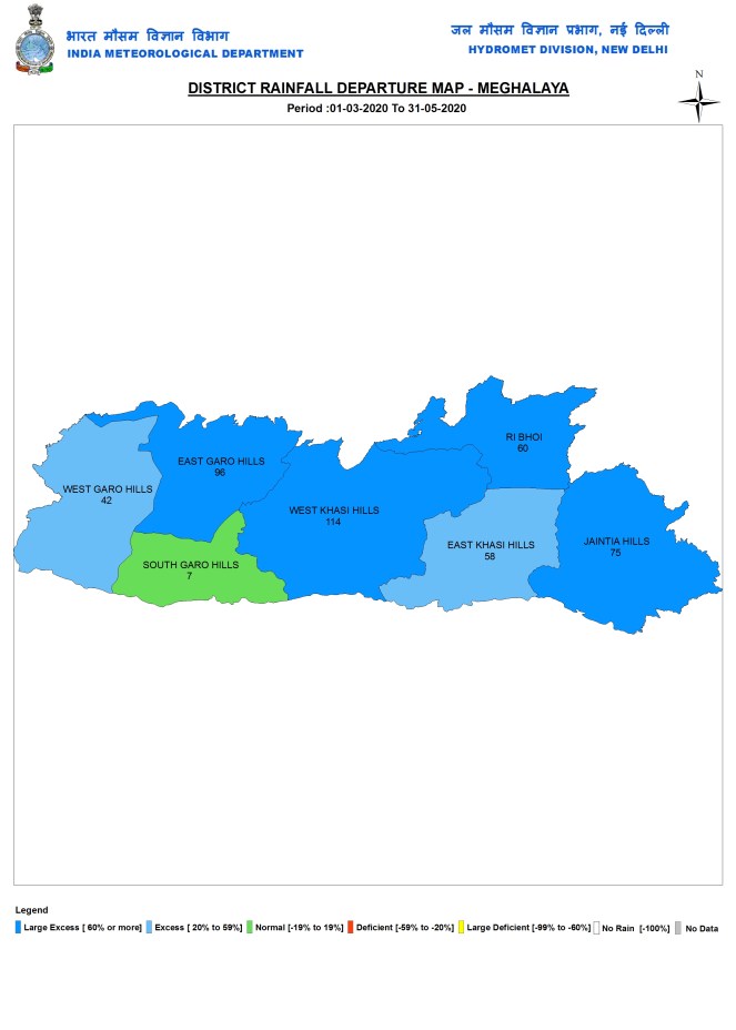 Meghalaya During pre monsoon 2020 season, Meghalaya received 1291.4 mm or 71% above normal rainfall. Among the seven districts of the state, South Garo Hills had low of 679.8 mm, while East Khasi Hills had the High of 1867.5 mm.