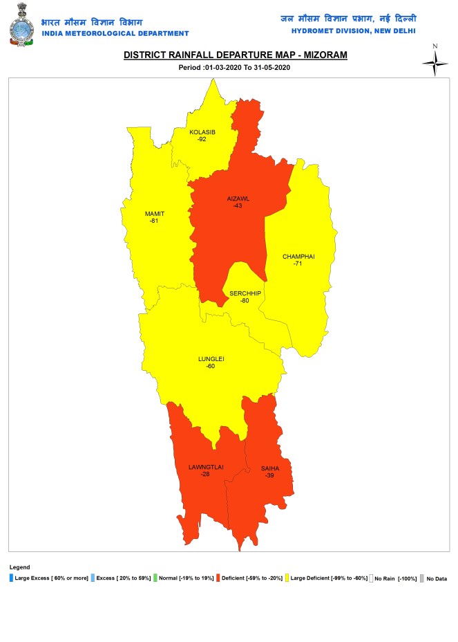 Mizoram During pre monsoon 2020 months, Mizoram had 222.8 mm, or 61% below normal rainfall. Among the eight districts, Kolasib with 53.1 mm had the lowest rainfall, while capital Aizwal district had the highest rainfall of 363.2 mm.