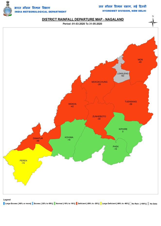 Nagaland During pre monsoon 2020 months, Nagaland received 270.5 mm or 28% below normal rains. IMD had no data for the Longleng district. Among the rest of the ten districts, Peren district had the lowest rainfall of 77.9 mm, while Mokokchung district had 348.7 mm.