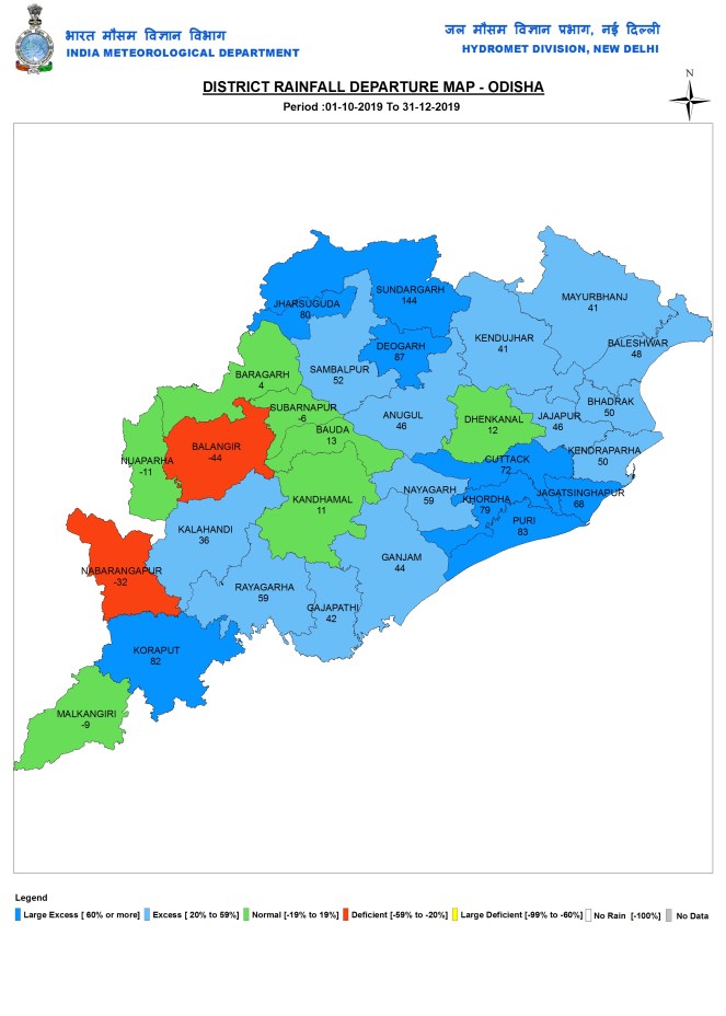 During post monsoon 2019 months, it received 188.6 mm or 44% above normal rainfall. The rainfall ranged from 48.5 mm in Balangir district again, to 371.4 mm in Puri district.