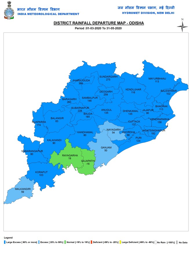 Odisha During pre monsoon 2020 months, Odisha received 265.4 mm rains, 107% above normal. The rainfall range was from 134.5 mm in Balangir district to 448.8 mm in Mayurbhanj district.