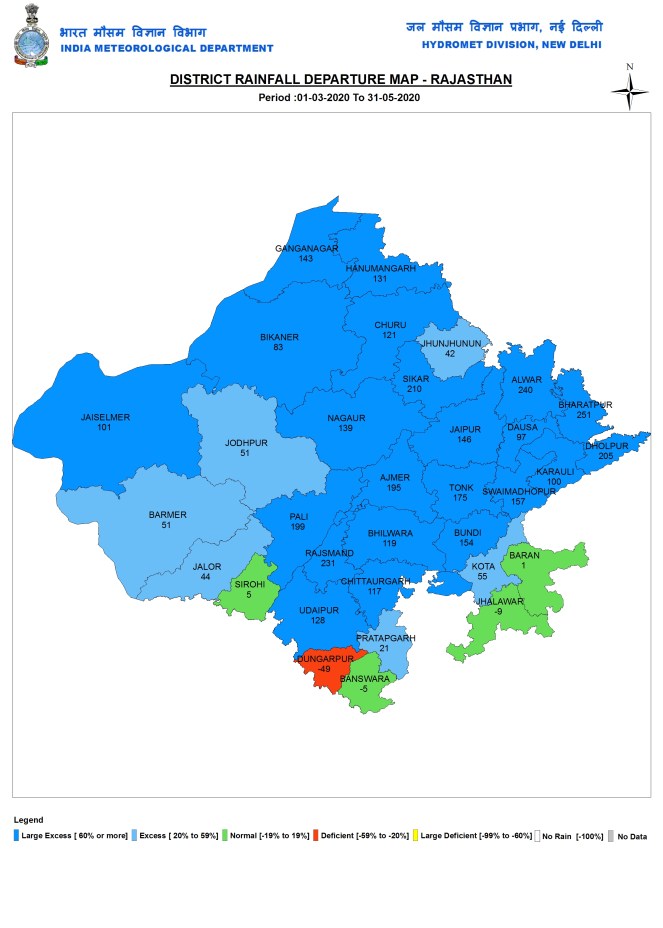 WEST INDIA: Rajasthan During pre monsoon 2020 season, Rajasthan had 44.9 mm rain, 114% above normal rains. West Rajasthan had 44.7 mm, 99% above normal rains. East Rajasthan had 45.2 mm or 138% above normal rains.