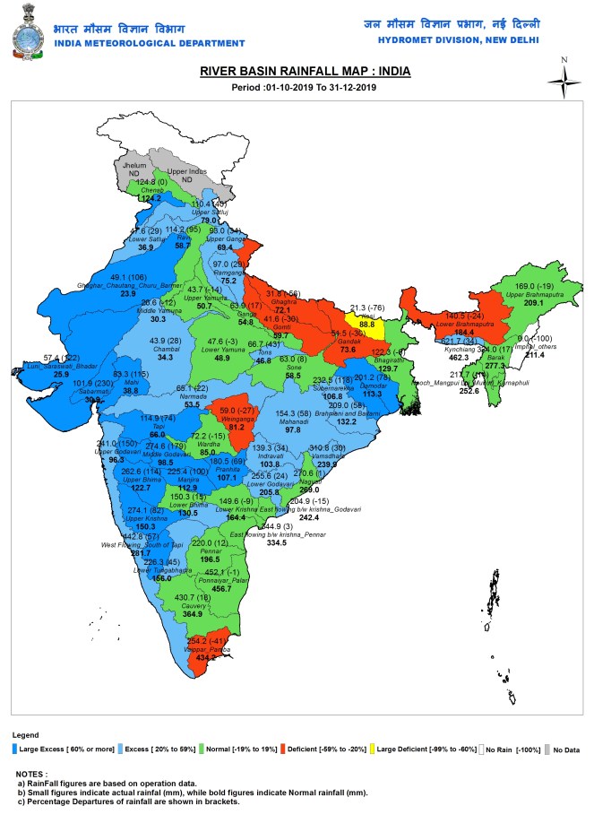During the post monsoon 2019 season, Kosi basin (N Bihar) had the highest deficit at 76% and lowest rainfall at 21.3 mm. Kynchiang basin in Meghalaya again had the highest rainfall at 621.7 mm. For Jhelum and Upper Indus, IMD again had no data. Sabarmati river again had the highest surplus at 230%.