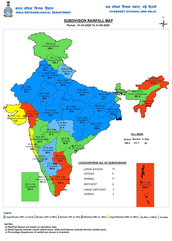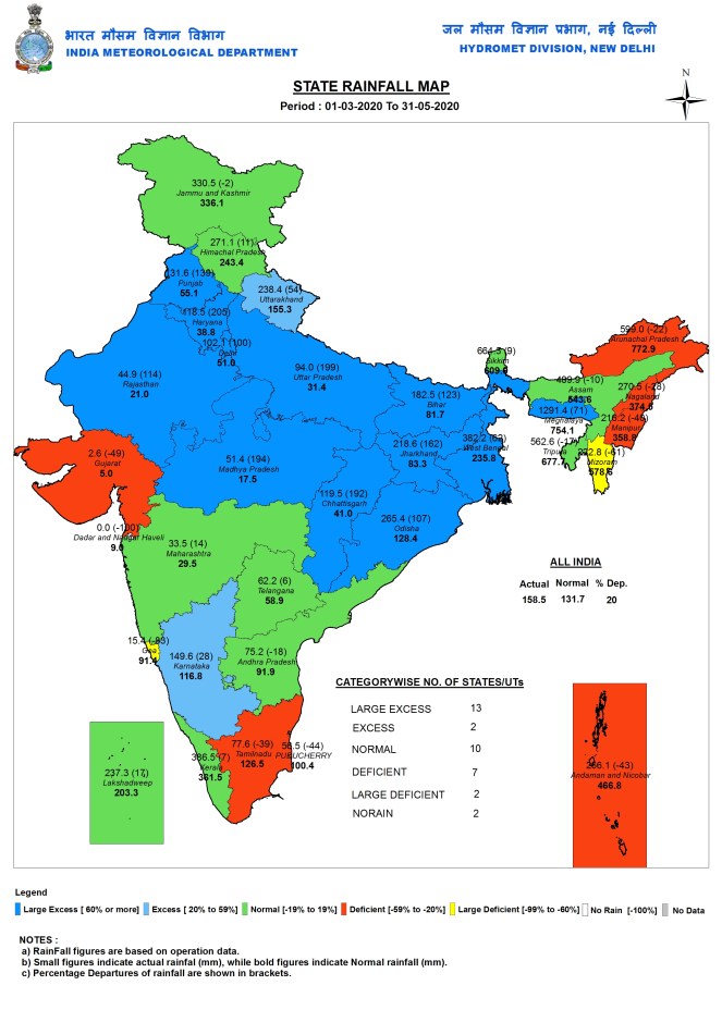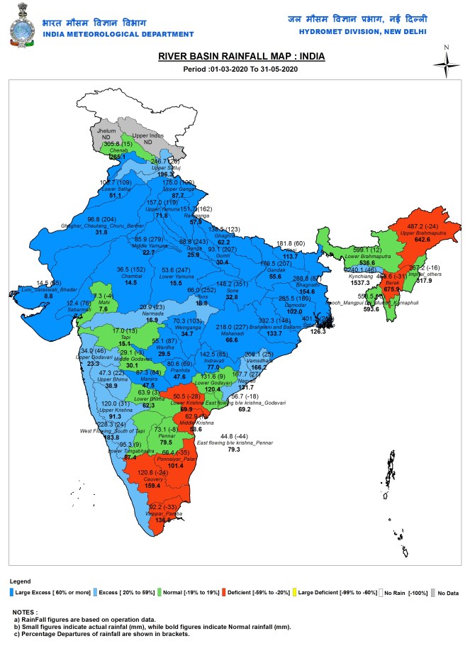 Here we are giving a detailed account of the pre-monsoon season rainfall that India received in the season just ended on May 31, 2020, including state wise, sub division wise, river wise and also district wise figures. Along with it, we also provide the figures of post monsoon figures for the just concluded water year. For the winter season (Jan-Feb 2020) we have only the figures for Jan 2020 since we missed downloading the Feb 2020 figures. We had already provided the monsoon 2019 figures through two blogs in October 2019[ii].