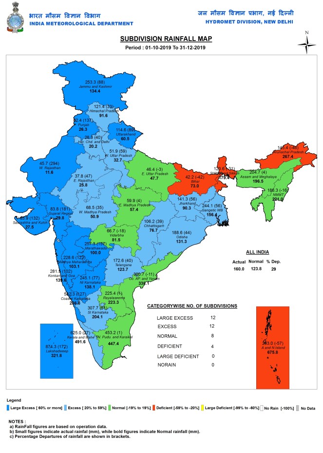 During Post monsoon 2019 season (Oct-Dec), India received 160 mm rainfall, 29% above normal (123.8 mm). Lakshadweep islands got the highest rainfall among states at 874.3 mm, 172% above normal. Goa had the highest surplus at 180%. Andaman and Nicobar had the highest deficit at 57%. Haryana had the lowest rainfall at 27.9 mm.