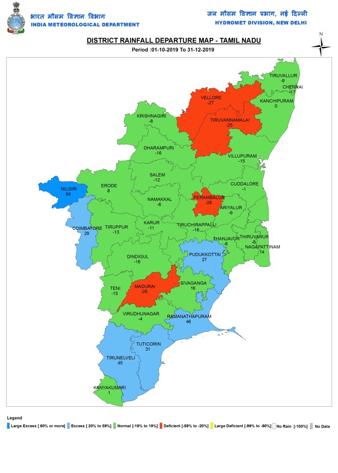 However, during post monsoon 2019 season, Tamil Nadu received 452 mm or 1% above normal rainfall.
