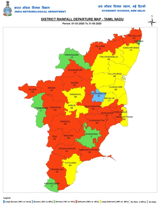Tamil Nadu During pre monsoon 2020 season, Tamil Nadu received 77.6 mm or 39% below normal rains.