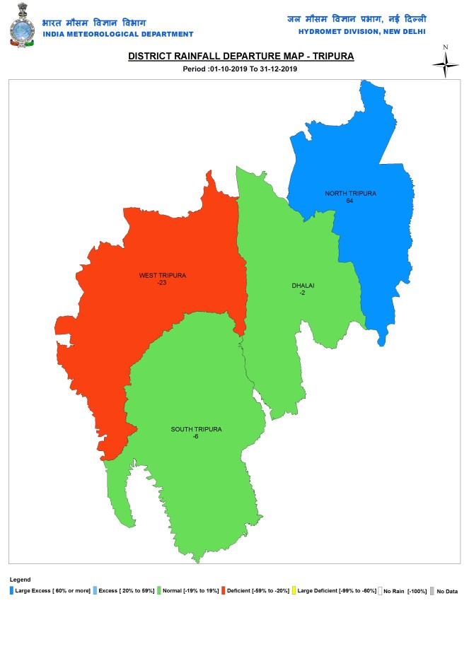 During post monsoon 2019 months, Tripura had 239.7 mm or 8% above normal rains. West Tripura again had the lowest rainfall at 170.8 mm, while North Tripura had the highest at 350.9 mm.
