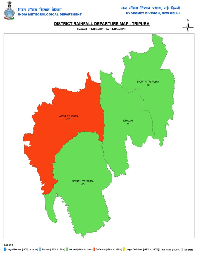 Tripura During pre monsoon 2020 season, Tripura got 562.7 mm or 17% below normal rains. Among the 4 districts, West Triura had the lowest rainfall at 449.6 mm while Dhalai had the highest at 654.3 mm.