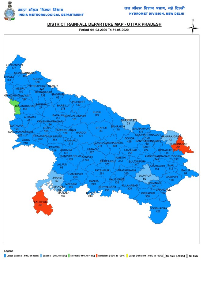 Uttar Pradesh During Pre monsoon 2020 season, Uttar Pradesh received 94 mm rains, 199% above normal rains. East UP got 97.6 mm, which was 201% above normal. West UP got 88.5 mm or 196% above normal rains.