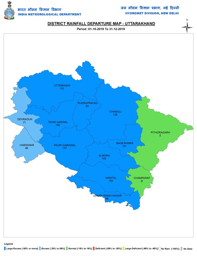 During post monsoon 2019 season Uttarakhand had 114.6 mm rainfall, 89% above normal. Two districts each had normal and excess rainfall and rest 9 had Large Excess rains. Nainital at 165.8 mm had the highest rainfall and Haridwar had the lowest at 52.4 mm.