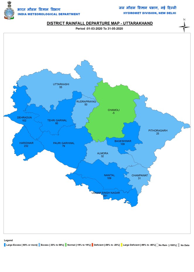 Uttarakhand During Pre Monsoon 2020 season, Uttarakhand had 238.4 mm rainfall, 54% above normal. One of the 13 districts had normal, four had Excess and rest eight had Large Excess rainfall. Uttarkashi had the highest rainfall at 299.3 mm and Champawat had the lowest at 144.5 mm. Haridwar had the highest surplus at 232%.