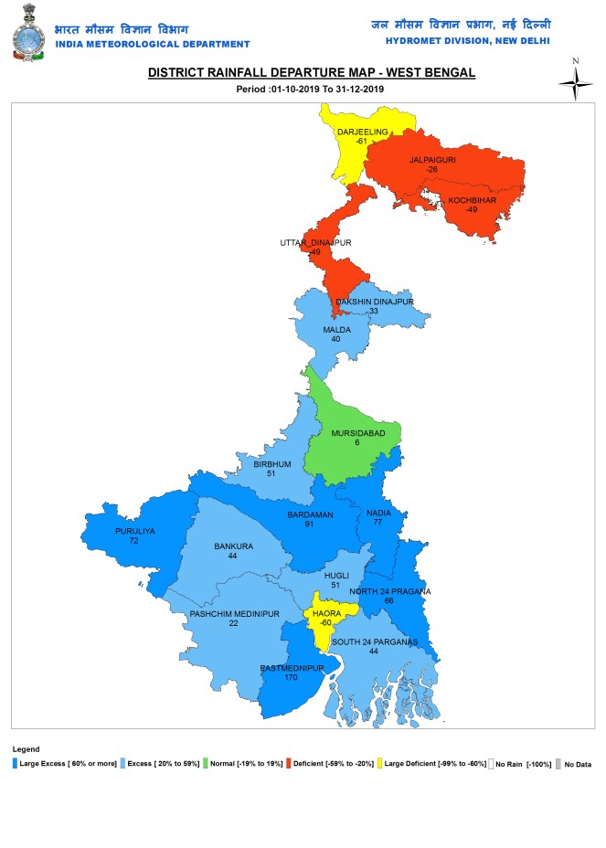 During post monsoon 2019 months, W Bengal received 215.5 mm or 35% above normal rains. The rainfall ranged from 65.2 mm in Howrah to massive 570.4 mm in East Mednipur.