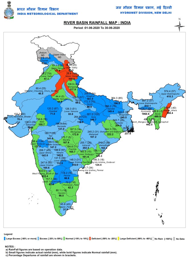 This is India’s wettest June 12 years, The Times of India reported on July 1, 2020. Agriculture Ministry Data shows that sowing is 68% higher at 31.56 m ha. The June rainfall was 202 mm in 2008, the rainfall this year is the highest since then. All four IMD regions (Northwest, Central, South, East & NE) have recorded surplus rainfall, the surplus is the highest in Central (30.5% surplus) and E-NE (15.7%) regions. North West India had the lowest surplus at 3.5%. IMD Head Mrutyunjay Mohapatra said that whole of India was covered by monsoon on June 26, 12 days ahead of the normal date of July 8.