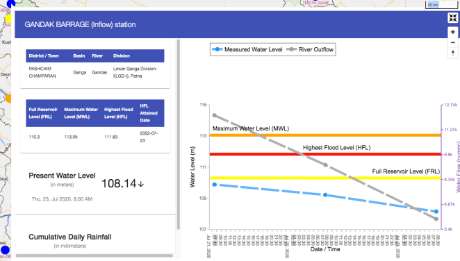 The CWC-FF division gave first warning of this flood episode through this tweet on July 20, 2020, warning: “River Narayani (Nepal) / River Gandak in India flowing 1.47 m above Danger Level at Devghat in #Chitwan District of #Nepal. Likely to enter India through Gandak Barrage and thence through Kushinagar Dt of UP and Gopalganj Dt of Bihar. courtesy http://hydrology.gov.np”