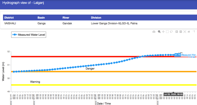 About 20 kms further downstream of Rewaghat is the Lalganj flood monitoring site of CWC in Vaishali district. Here the earlier HFL of 51.624 m (achieved on Aug 4, 2001) was crossed at 1800 hrs on July 24, new high level of 51.75 m was reached at 0300 hrs on July 25, and after remaining at that level for three hours, the receding water level went below HFL of 51.624 by 1400 hrs on July 25, 2020. Thus at Lalgunj, 19 year old flood level was reached to record a new HFL that is 13 cm above the old one and water level remained above HFL of 51.624 m for about 20 hours.