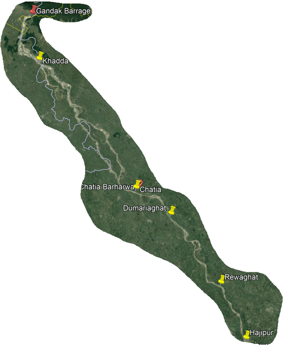 The river Gandhak originates in Tibet at an altitude of 7620 m above MSL in the north east of Dhaulagiri near Nepal border at Latitude 29018′ N and Longitude 83058’E, in the snowy peaks of the Himalayas. The river enters the Indian territory near Tribeni town in Nepal. There after the river flows in a southerly direction and forms boundary between Uttar Pradesh and Bihar. It flows through the west Champaran, East Champaran, Muzaffarpur, Gopalganj, Siwan, Saren and Vaishali districts of Bihar and Gorakhpur and Deoria district of Uttar Pradesh before joining Ganga at Hazipur.[v]