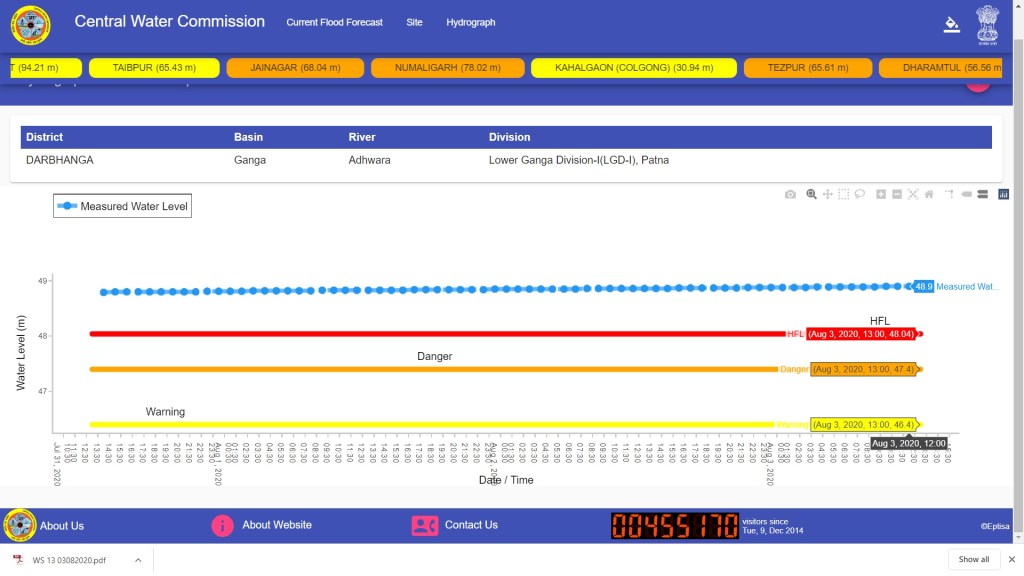 Adhwara river at Bishunpur site in Darbhaga flowing above HFL since July 25 (9 days) with steady upward trend. Currently on Aug 03 at 13:00 hours, its 0.86 metre above the previous HFL. Its unusual. http://ffs.tamcnhp.com/main/hydrograph-detail/034-mgd4PTN