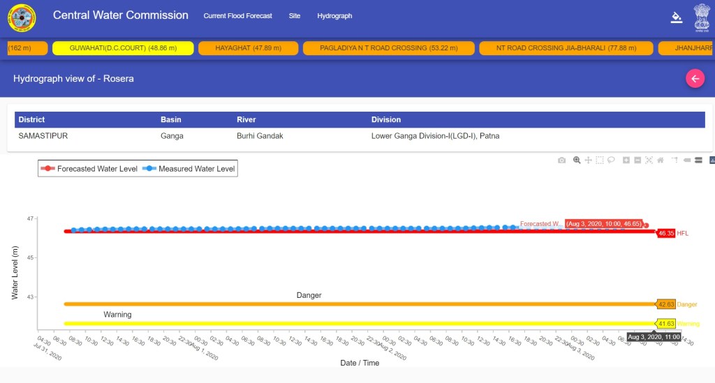 Burhi Gandak river has breached previous HFL 46.35 metre attained on 16.08.1987 at Rosera site in Samastipur on 31.07.2020 around ~07:00 hours and continue to flow at 46.56 metre which is 0.21 metre above the HFL. http://ffs.tamcnhp.com/main/hydrograph-detail/006-mgd4ptn