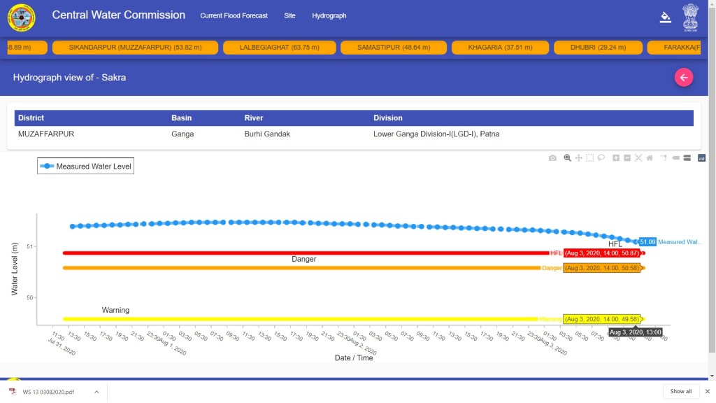 On 28.07.2020 ~19:00 hrs, River Burhi Gandak at Sakra site in Muzaffarpur dist has crossed previous HFL 50.87 m attained on 28.08.2017 & currently flowing at 51.40 metre which 0.53 metre above the HFL. https://twitter.com/CWCOfficial_FF/status/1289079840973312000