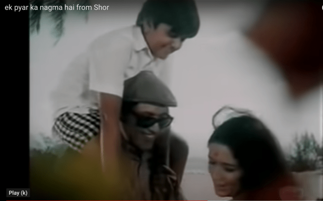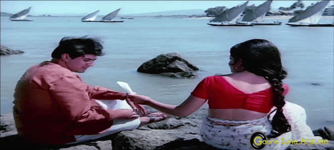 In this song sung by Kishore Kumar, Jitendra is on the boat, singing and Hema Malini is on the banks. A bit uncharacteristically of Gulzar, he indulges in some rather complex word play: “कोई किनारा – जो किनारे से मिले वो अपना किनारा है”, though “कागजों की कश्तियों का कहीं किनारा होता नहीं” is possibly understandable.