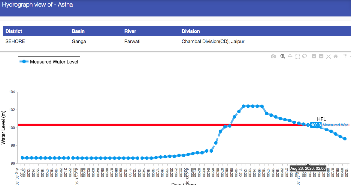 3. At Astha on Parwati River in Sehore Dist, MP old HFL of 100.32 m (reached on Sept 8, 2019) crossed at 0900 hrs on Aug 22, 2020. New High level of 102.4 m, 2.08 m above old HFL was at 1200 hrs and remained at that level for about four hours. The water level came down below the old HFL at 0200 hrs on Aug 23, 2020. Thus the water level here remained above HFL for 17 hours.