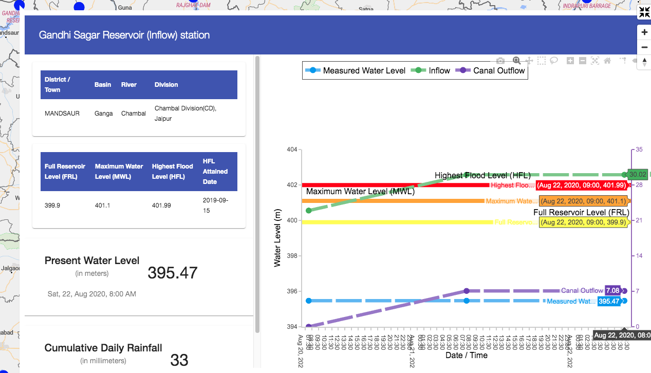 The inflows into Gandhi Sagar Dam on Chambal River till 1300 hrs on Aug 22, 2020 was just 30 cumecs, has already reached 3322 cumecs, or 110 times higher levels and is forecast to touch 6000 cumecs. The water level at the dam on Aug 20 was 395.47 m (FRL 399.9 m), with reservoir live capacity 61% full. It went up to 396.03 m by 0800 hrs on Aug 23. This means there is some storage space in the reservoir.