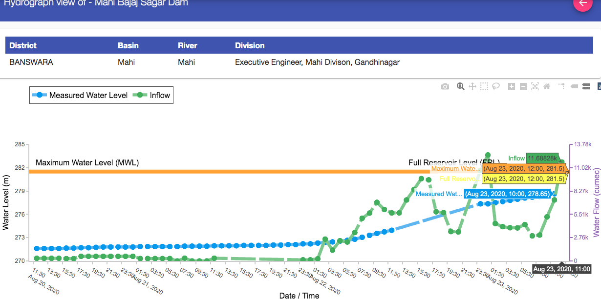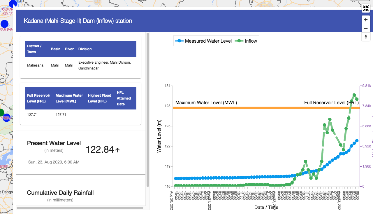 There is also Panam dam on another tributary of Mahi river in Gujarat, here inflow increased from 36 cumecs on Aug 23 morning to 60 fold higher figure of 2020 cumecs next morning.