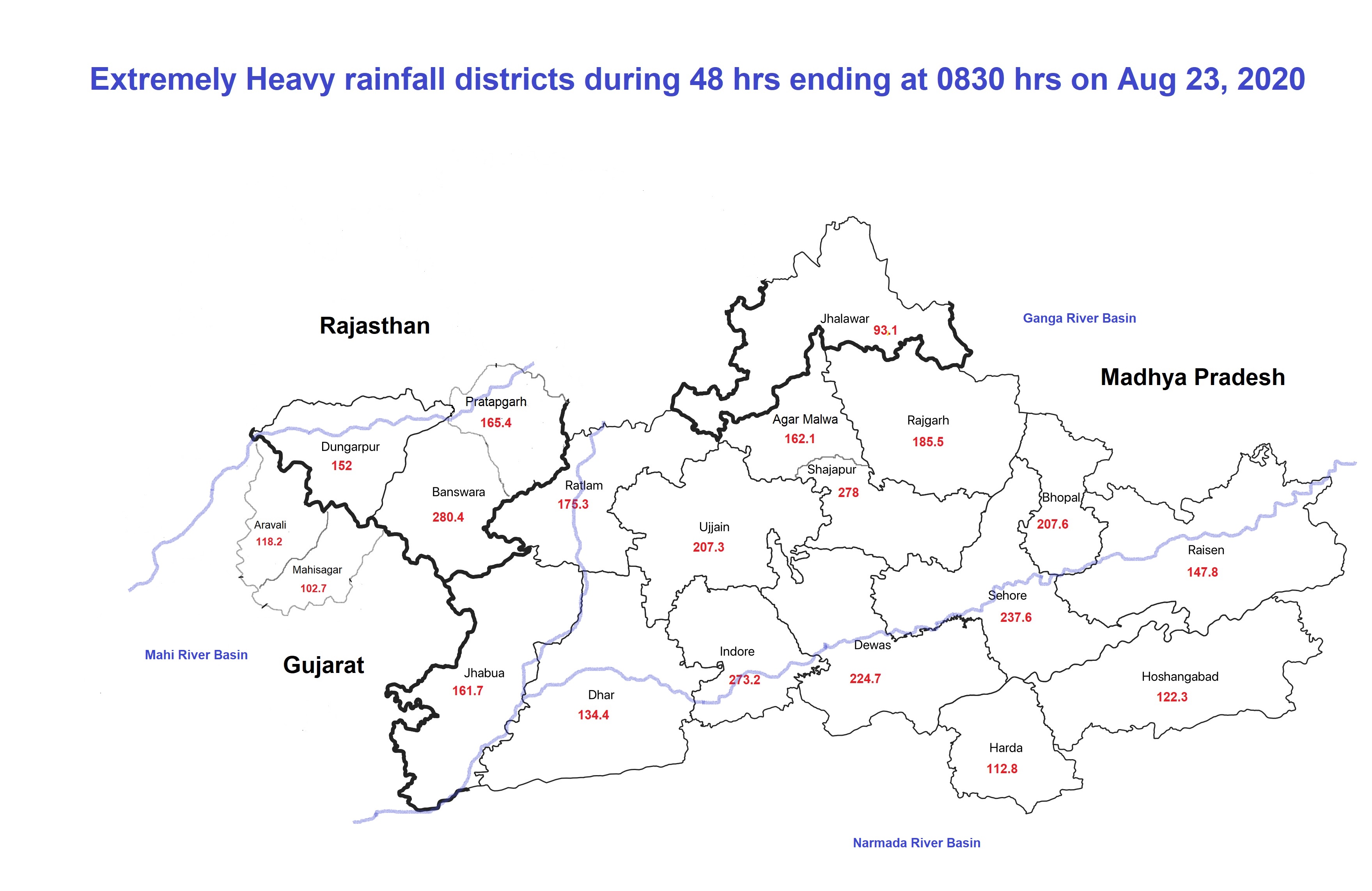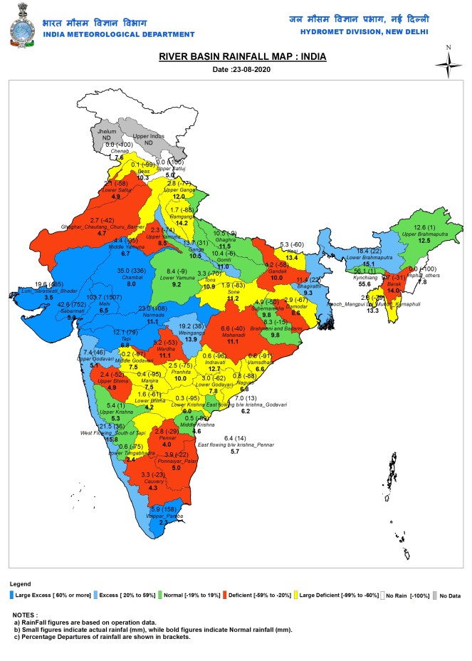 Mahi Basin To the West of the mapped districts, is the Mahi River Basin, flowing from Rajasthan and MP to Gujarat. As per IMD’s River Basin Rainfall Map for Aug 23 (24 hrs ending at 0830 hrs on Aug 23), Mahi basin as a whole received massive 103.7 mm rainfall in 24 hours, 1507% above normal.