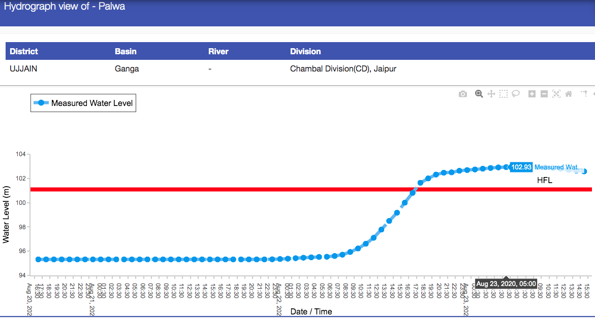 1. At Palwa, on Chamla River in Ujjain Dist, old HFL of 101.09 m crossed at 1730 hrs on Aug 22, 2020. It reached a new HFL of 102.93 (huge 1.84 m above the previous HFL) m and stayed at that level between 0500 and 0800 hrs on Aug 23, 2020. Over 24 hours after crossing HFL, it remains above HFL as we write this. Previous HFL was crossed on Aug 9, 2019, as per information provided (for all three sites) by CWC FF Director Shri Sharad Chandra to SANDRP. Chamla River confluences with Chambal just upstream of Nagda town. Water level here came below HFL only by 0100 hrs on Aug 24. So water level remained above HFL for 31.5 hours.