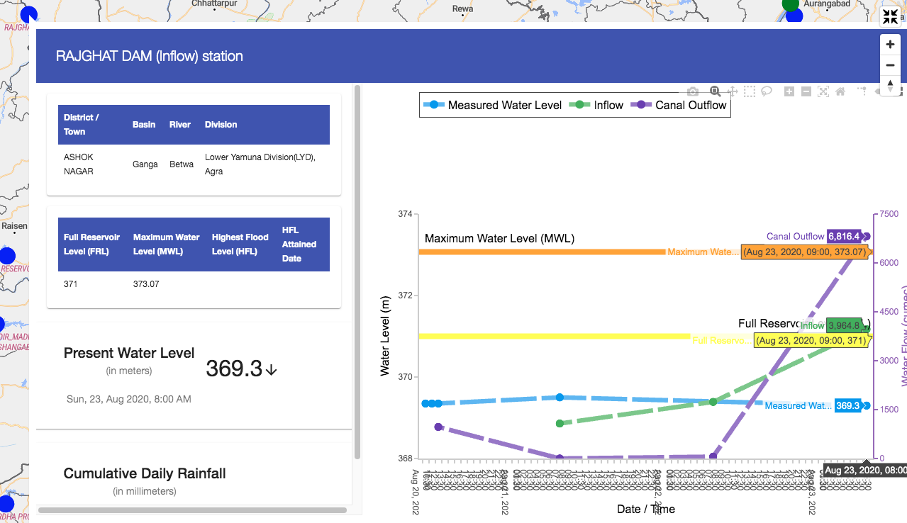 Betwa Basin To the East of the high downpour region is the Betwa basin. Here the Rajghat dam had inflow of about 1300 cumecs on Aug 21, which was forecast to jump over five fold to 6605 cumecs. Outflow was expected to jump from zero to 6806 cumecs.