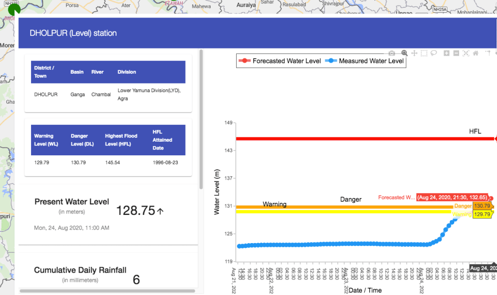 Water Level at flood forecasting site at Dholpur (UP) on Chambal River started rising and is expected to cross the danger level on Aug 24 night. This is basically due to Parwati and other tributaries meeting Chambal downstream of Kota city, since the hydrograph at Kota City is stable, yet to start rising as outflows from upstream dams complex have not yet started.