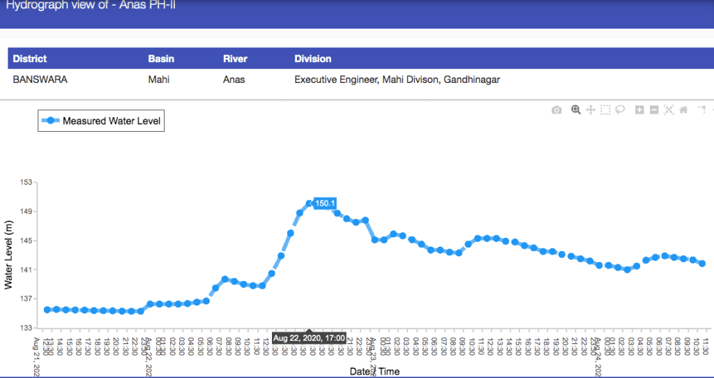 As can be seen in the hydrograph below, the Anas PH-II site on Anas river, a tributary of Mahi, in Banswara district, the water level rose by a massive 14.8 m in about 18 hours ending at 1700 hrs on Aug 22.