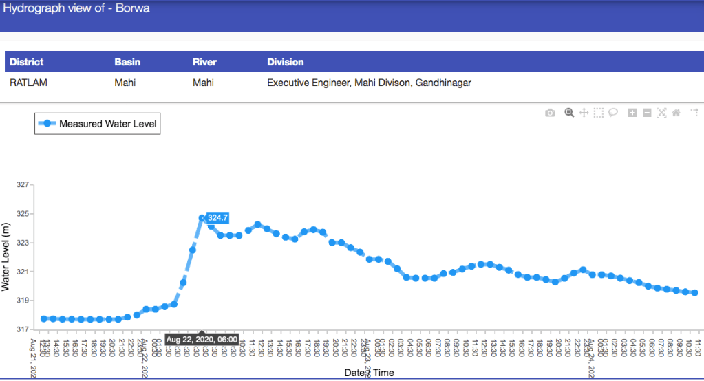 The hydrograph below shows how within nine hours, water level at Borwa site in Ratlam district in Madhya Pradesh rose by 7 meters to 324.7 m at 0600 hrs on Aug 22.