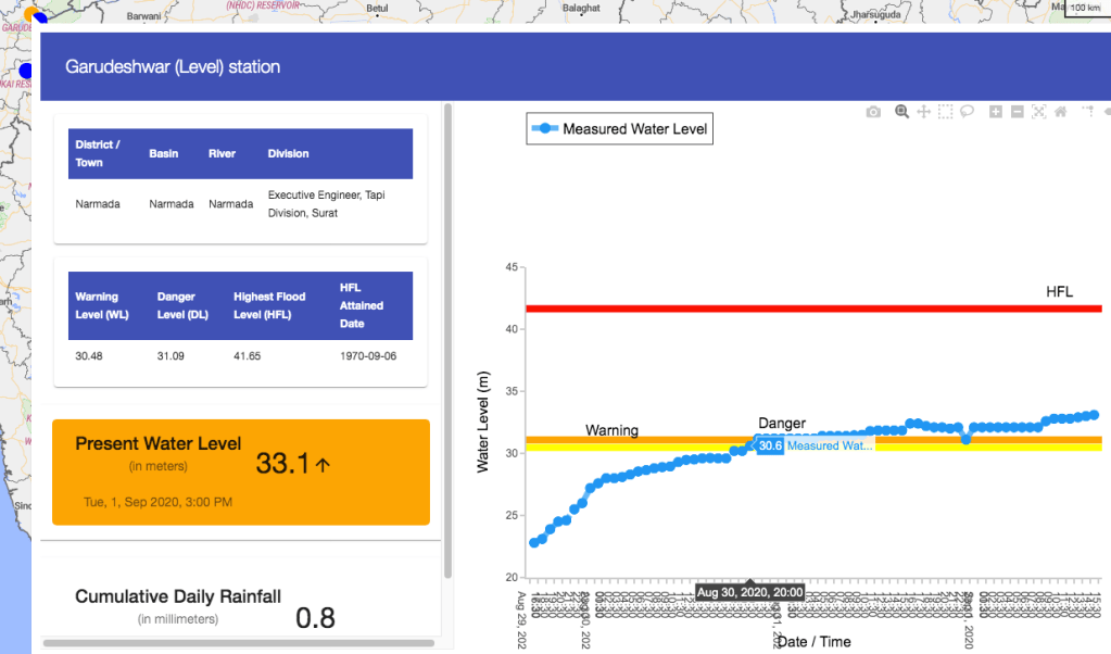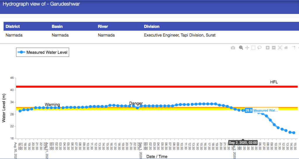 The following two hydrographs of Narmada River at Garudeshwar show that water level started climbing from around 22 m around 1600 hrs on Aug 29, went above the warning level of 30.48 m around 1900 hrs on Aug 30. Reached a peak of 33.1 m at 1500 hrs on Sept 1, started falling and then came down below the warning level by around 0000 hrs on Sept 2.
