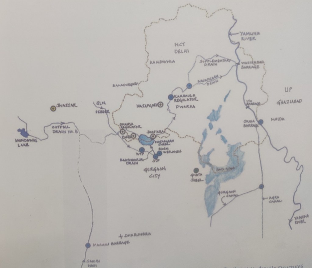 The existence of Najafgarh jheel has been recorded as far back as 1807 in an Antique SoI Map. The Najafgarh jheel used to be an immense wetland lying in Gurugram and Delhi. It was fed by the Sahibi river and floodwaters from Gurugram, Rewari, Jhajjar and north-west Delhi. The Delhi Gazatteer 1884 records that the jheel had a spread of over 220 sq. km. The drainage in Gurugram is mainly to the north wherein the surface runoff from the Aravallis and the surrounding areas would drain into the Najafgarh Jheel. The jheel in turn would drain into the Yamuna through an irregular channel known as the Sahibi nala.
