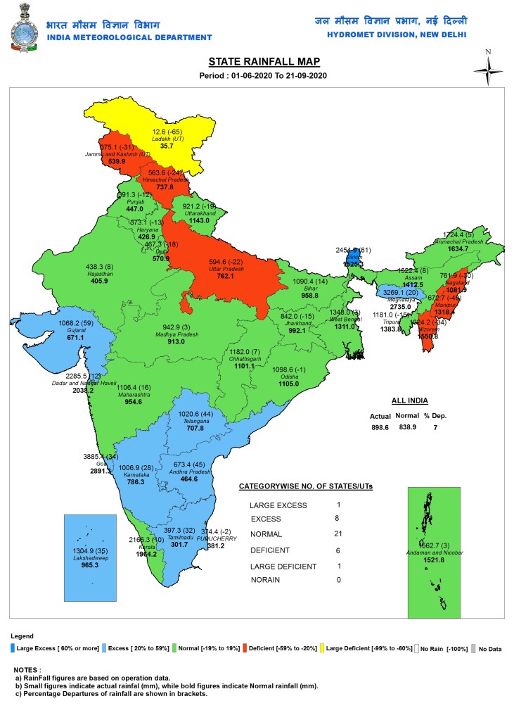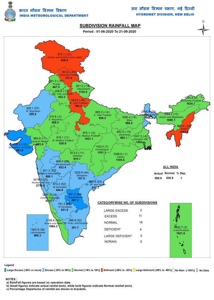 -The ministry of earth sciences had early this year come out with a report, ‘Observed Rainfall Variability and Changes’, analysing rainfall patterns over 28 states and the Union Territory of J&K based on 1989-2018 data. The report shows that seven states — Uttar Pradesh, Bihar, West Bengal, Himachal Pradesh, Arunachal Pradesh, Meghalaya and Nagaland — have shown “significant decreasing trends” in annual rainfall in the last 30 years. https://timesofindia.indiatimes.com/india/extremely-heavy-rainfall-events-up-100-in-3-years/articleshow/78158286.cms (17 Sept. 2020)