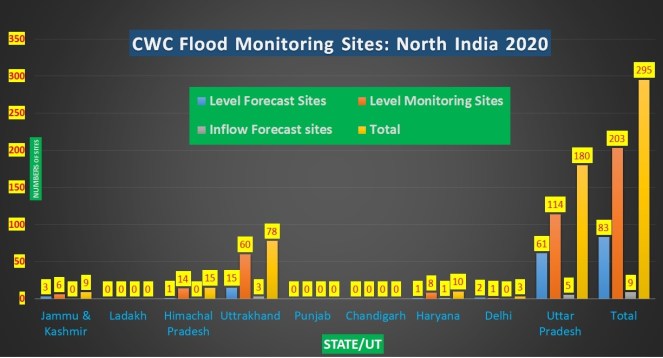 SANDRP Blog North India; CWC Flood Forecasting Sites 2020; New Website Old Problems In 2020, the North India region comprising of 5 states and 4 UTs have 295 sites of which 83 are Level Forecasting, 203 are Level Monitoring and 9 are Inflow Forecasting sites.