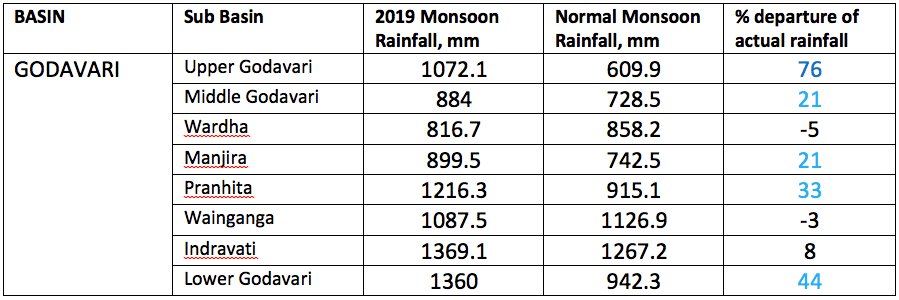 As an be seen above, in five of the sub basins, there was in Surplus or Large Surplus (Upper Godvari) category this year, highest surplus of 76% in Upper Godavari sub basin again like in 2019. Only two sub basins had lower rainfall this year compared to last year: Wainganga and Indravati sub basins.