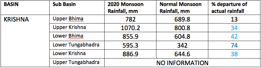In 2020 monsoon, all sub basins here had higher rainfall than 2018 and 2019 monsoons, except Upper Bhima and Upper Krishna. The Lower Tungabhadra basin had the lowest rainfall of 595.3 mm. Upper Krishna basin had the highest rainfall (1070.2 mm). Lower Tungabhadra had the highest surplus (74%) among all the sub basins here. Lower Bhima basin had the highest increase in rainfall compared to last year, from deficit 16% last year to surplus 42% this year.