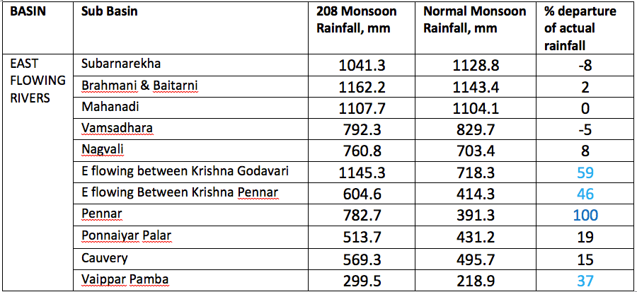 One sub basin (Pennar) is in Large Surplus category and three sub basins in fact surplus category: E flowing rivers between Godavari & Krishna, E flowing rivers between Krishna and Pennar and Vaippar-Pamba sub basin, the last one has the lowest normal rainfall of all the sub basins. It also has the lowest actual rainfall among all sub basins of India.