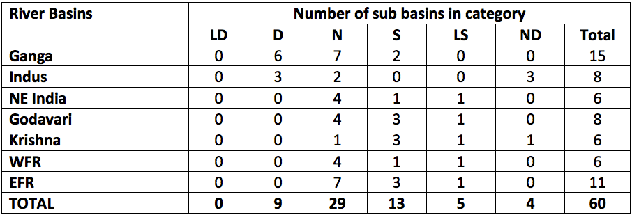 Summary Following table provides summary situation of categories of sub basins for each of the basins as per IMD categorization of Large Deficit (over 59% deficit compared to Long Period Average (LPA)), Deficit (deficit between 19 and 59% of LPA), Normal (19% above LPA to 19% below LPA), Surplus (19 to 59% above LPA) and Large Surplus (over 59% above LPA) and ND (NO DATA).