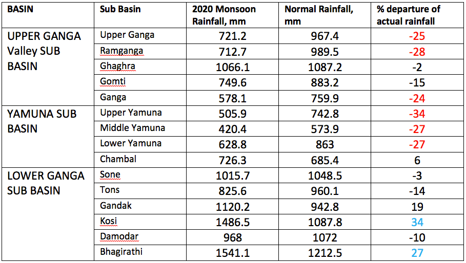 Six (Two in 2019) of the 15 sub basins here are categorised to have deficit rainfall: Upper, middle & lower Yamuna; Upper Ganga, Ganga and Ramganga. Two (one in 2019) sub basins are categorised as Surplus: Kosi and Bhagirathi. However, it was Gandak including Burhi Gandak basin that suffered more floods. Bagmati basin also suffered floods. The lowest rainfall was again, like in 2019, in Middle Yamuna sub basin (420.4 mm) and the highest (1541.1 mm) in Bhagirathi basin again like in 2019, in W Bengal. Kosi (1486.5) was the second highest rainfall basin. Sone, Gandak and Ghagra also had over 1000 mm rainfall.