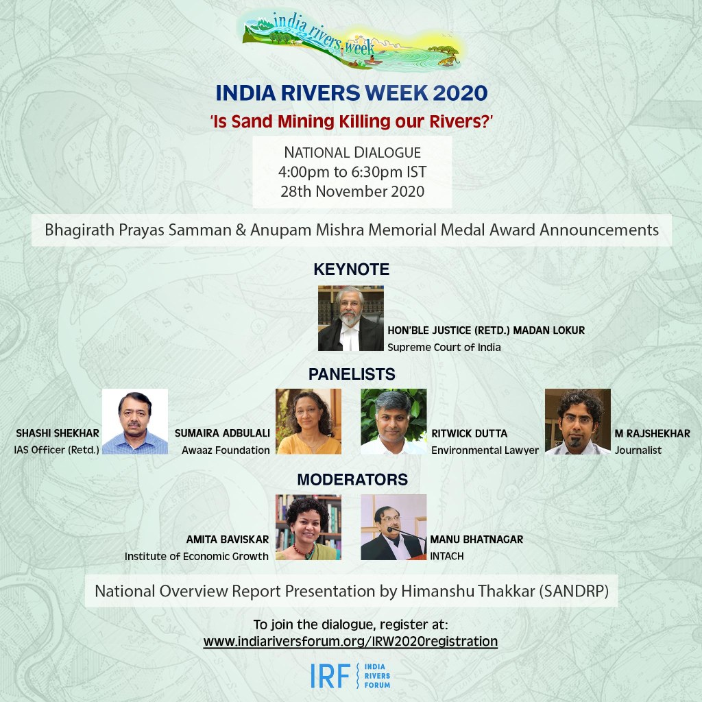 Chaired by Justice (Retd) Madan Lokur of Supreme Court of India, the India Rivers Week (IRW) 2020[i] ended at a well attended National Dialogue on River Sand Mining, and giving away of Bhagirath Prayas Samman (BPS) and Anupam Mishra Memorial (AMM) Medal on Nov 28, 2020. This was culmination of the process that started with the North India River Sand Mining Dialogue on Oct 31, 2020[ii] and dialogues in South Zone[iii], West Zone[iv] and East Zone[v] in the following weeks. Several hundred people participated in the regional dialogues and the recordings continue to be watched by many more on Facebook live and youtube.